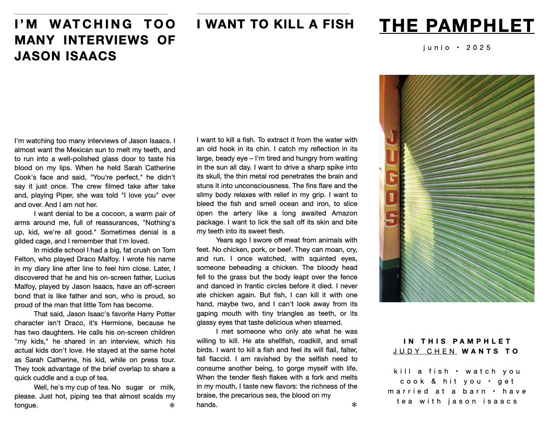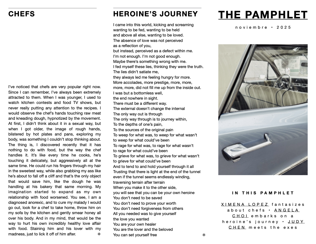 THE PAMPHLET is an experimental zine in the form of a pamphlet INFORMING you of poems, short stories, and other creative uses of the written word to leaf through and read at your leisure.
