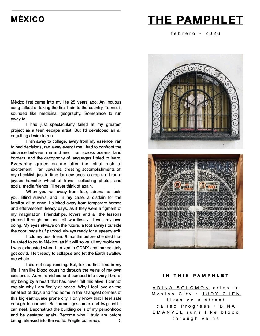 ADINA SOLOMON cries in Mexico City • JUDY CHEN lives on a street called Progress • BINA EMANVEL runs like blood through veins